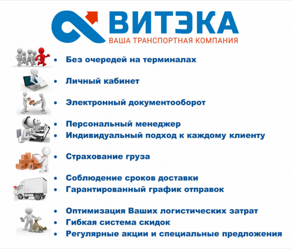 ООО «ВИТЭКА» – это динамично развивающаяся транспортная компания на рынке перевозок сборных грузов в России. Имеет свои представительства в разных регионах и обладает собственным автопарком. Выстраивает оптимальную логистическую схему перевозки, что позволяет осуществить доставку в установленные сроки по выгодным тарифам. Располагает широким спектром принимаемых грузов – от мелких до крупногабаритных.